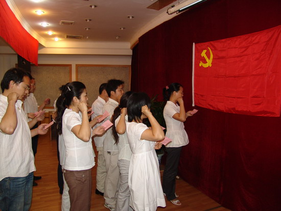 會(huì)上,新入黨的13名預(yù)備黨員在鮮艷的黨旗下舉起右拳,鄭重宣誓“我志愿加入中國(guó)共產(chǎn)黨,擁護(hù)黨的綱領(lǐng),遵守黨的章程……”