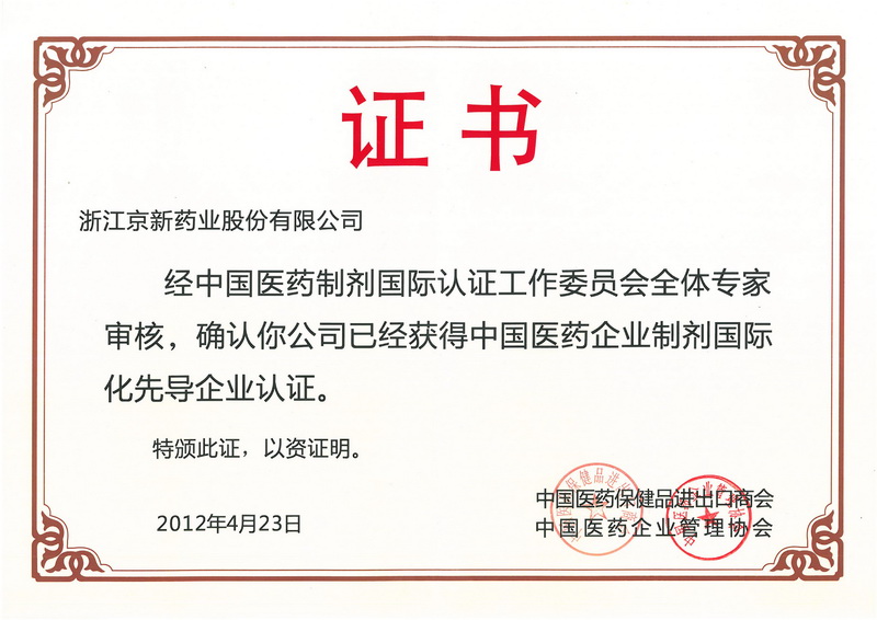 4月23日,第67屆全國(guó)藥品交易會(huì)上舉辦了2012中國(guó)醫(yī)藥企業(yè)營(yíng)銷高峰論壇,論壇正式發(fā)布了“中國(guó)醫(yī)藥國(guó)際化制劑認(rèn)證企業(yè)第一批先導(dǎo)性企業(yè)”名單,共有15家醫(yī)藥企業(yè)獲此殊榮,京新藥業(yè)名列其中。