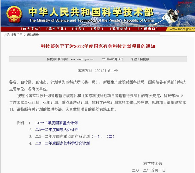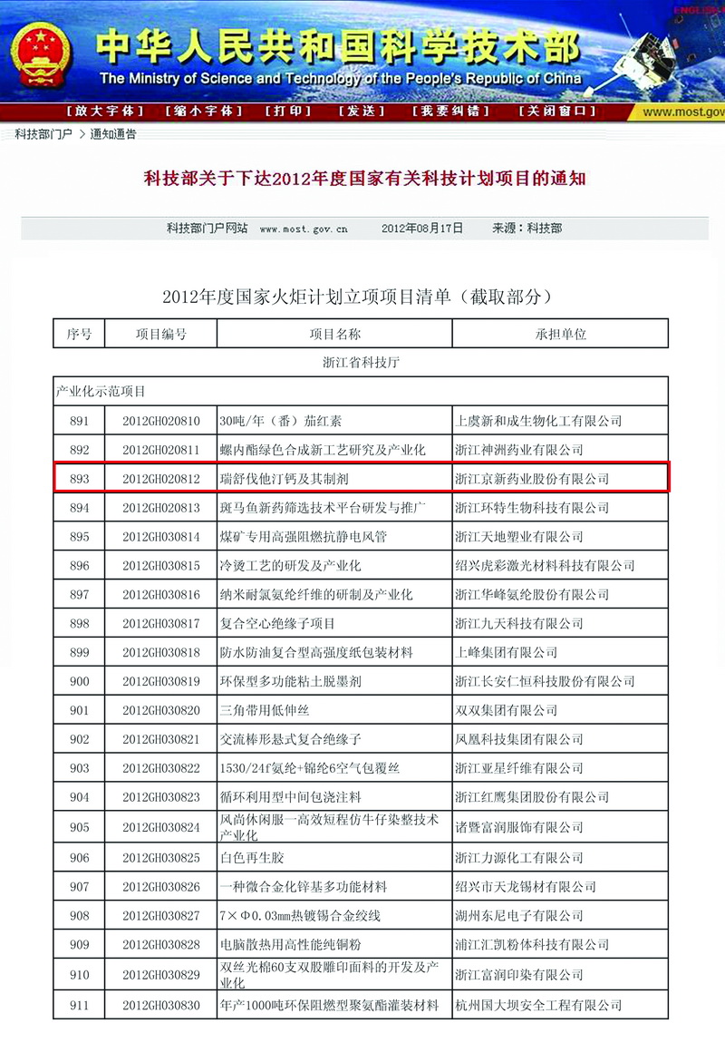 近日,中華人民共和國科學(xué)技術(shù)部官方網(wǎng)站公布了“科技部關(guān)于下發(fā)2012年度國家科技計(jì)劃項(xiàng)目的通知”。我公司研究開發(fā)的瑞舒伐他汀鈣及制劑項(xiàng)目被列入2012年度國家火炬計(jì)劃項(xiàng)目(產(chǎn)業(yè)化示范項(xiàng)目)。